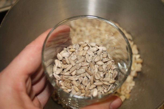 Семечки добавить к гречке (ее следует откинуть на сито), кешью слить и порубить. Также добавить в общую чашку. Всыпать кунжутные семечки.