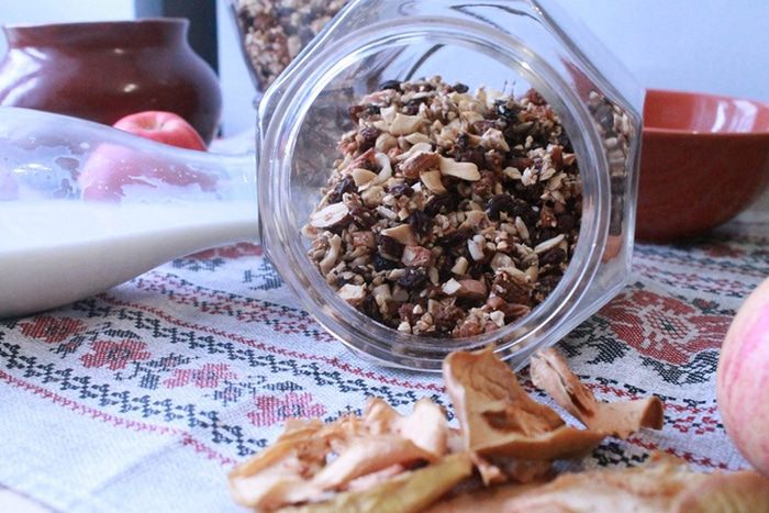 Все перемешать и разложить на противень. Сушить 10-11 часов в духовке при 50°С. Дверца духовки должна быть приоткрыта.