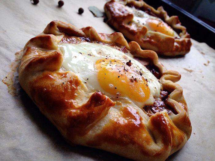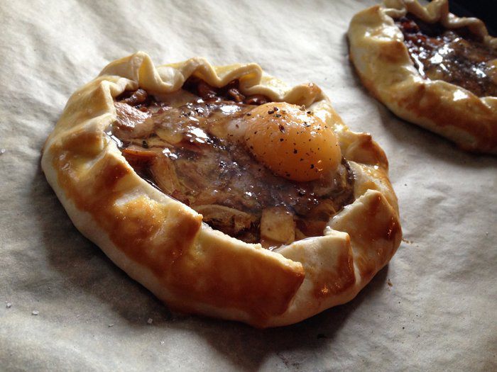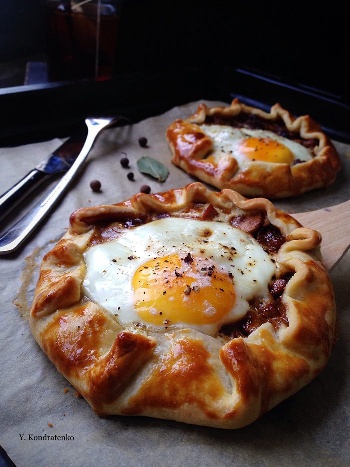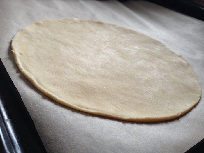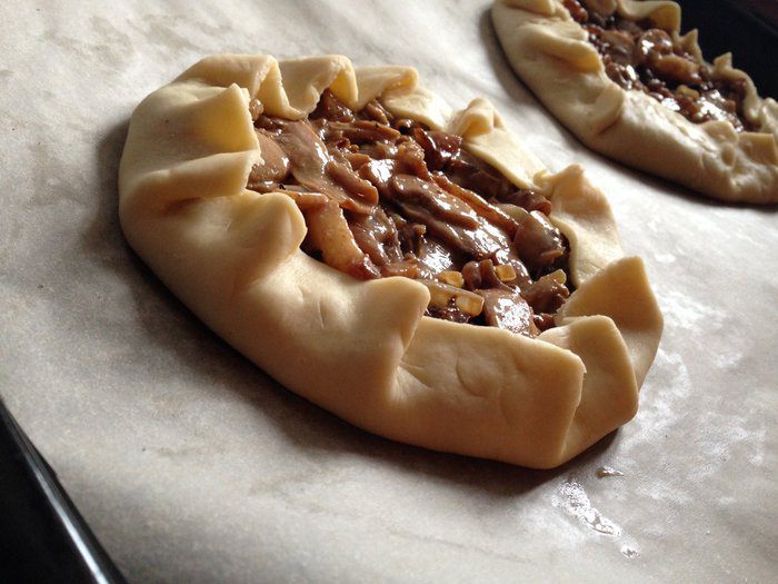 Сначала обжарить лук, добавить буквально щепотку-две сахара — для карамелизации. Затем добавить бекон — чуть обжарить его и грибы! Прожариться все минут 5-7. В конце добавить сливки, хорошо перемешать посолить, поперчить и убрать с плиты. Дать начинки чуть остыть.