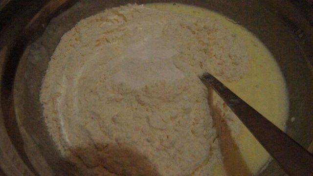 Добавить муку, разрыхлитель и растопленное сливочное масло. Замесить не тугое, нежное тесто.