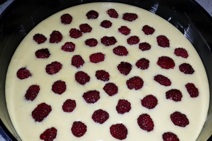 Вылить тесто в форму. Сверху выложить малину.