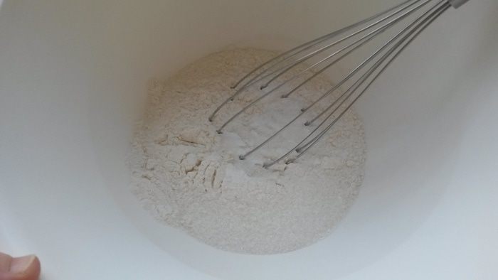 Смешиваем венчиком муку, разрыхлитель, соль и сахар.