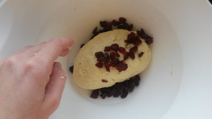 Добавляем клюкву (можно заменить изюмом), вмешиваем ее в тесто.