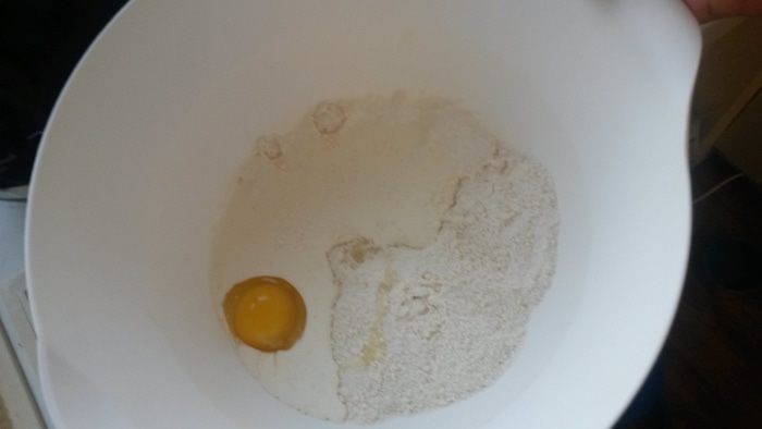 Добавляем сливки и яйцо, замешиваем тесто. Долго вымешивать не надо, просто собрать в однородный ком.